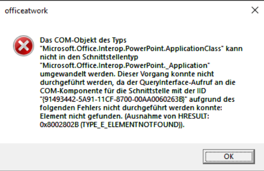Nach dem Update von Office 365 erscheint neim Starten des Word Mastertemplatemanagers oder des PowerPoint Mastertemplatemanagers die folgende Fehlermeldung und der Manager stürzt ab: