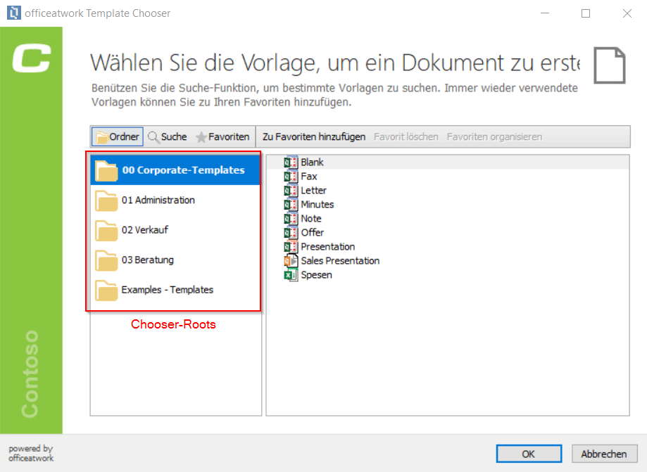 Die zentrale Ablage von officeatwork Vorlagen und Bausteinen kann in der Solution auf die jeweiligen Bedürfnisse angepasst und mit Chooser-Roots definiert und erweitert werden. Die sogenannten Chooser-Roots bilden einzelne Ordner innerhalb dieser zentralen Ablage (siehe nachfolgender Printscreen).