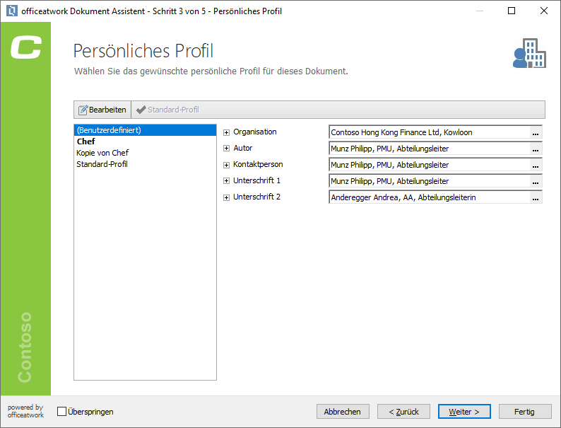 Hinweis: Die Anwendung des Default-Elements im DCML-File führt dazu, dass im officeatwork Assistent/Wizard bei der Auswahl des persönlichen Profils dies als "(Benutzerdefiniert)" angezeigt wird.