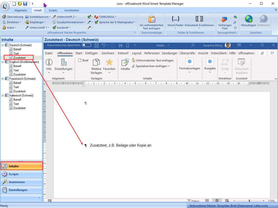 Zusätzlich müssen die sogenannten 'Slots', also die Zusatzangaben-Felder in den zugehörigen Master-Templates durch uns erfasst werden, damit sie in den Smart-Templates als Inhalte zur Verfügung stehen und die Formatierung ebenfalls wieder stimmt.