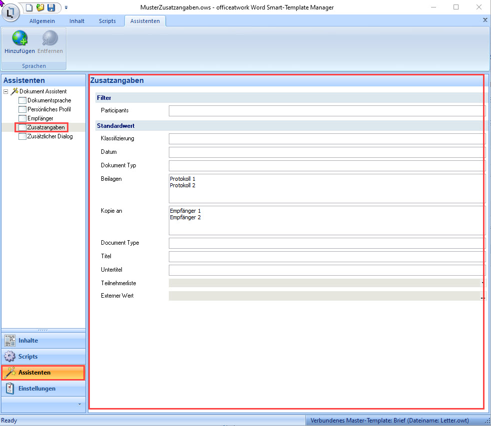 Sämtliche Texte, die im Bereich 'Assistenten', unter 'Zusatzangaben' erfasst wurden, müssen als 'Slots' in den Bereich 'Inhalte' übertragen werden.